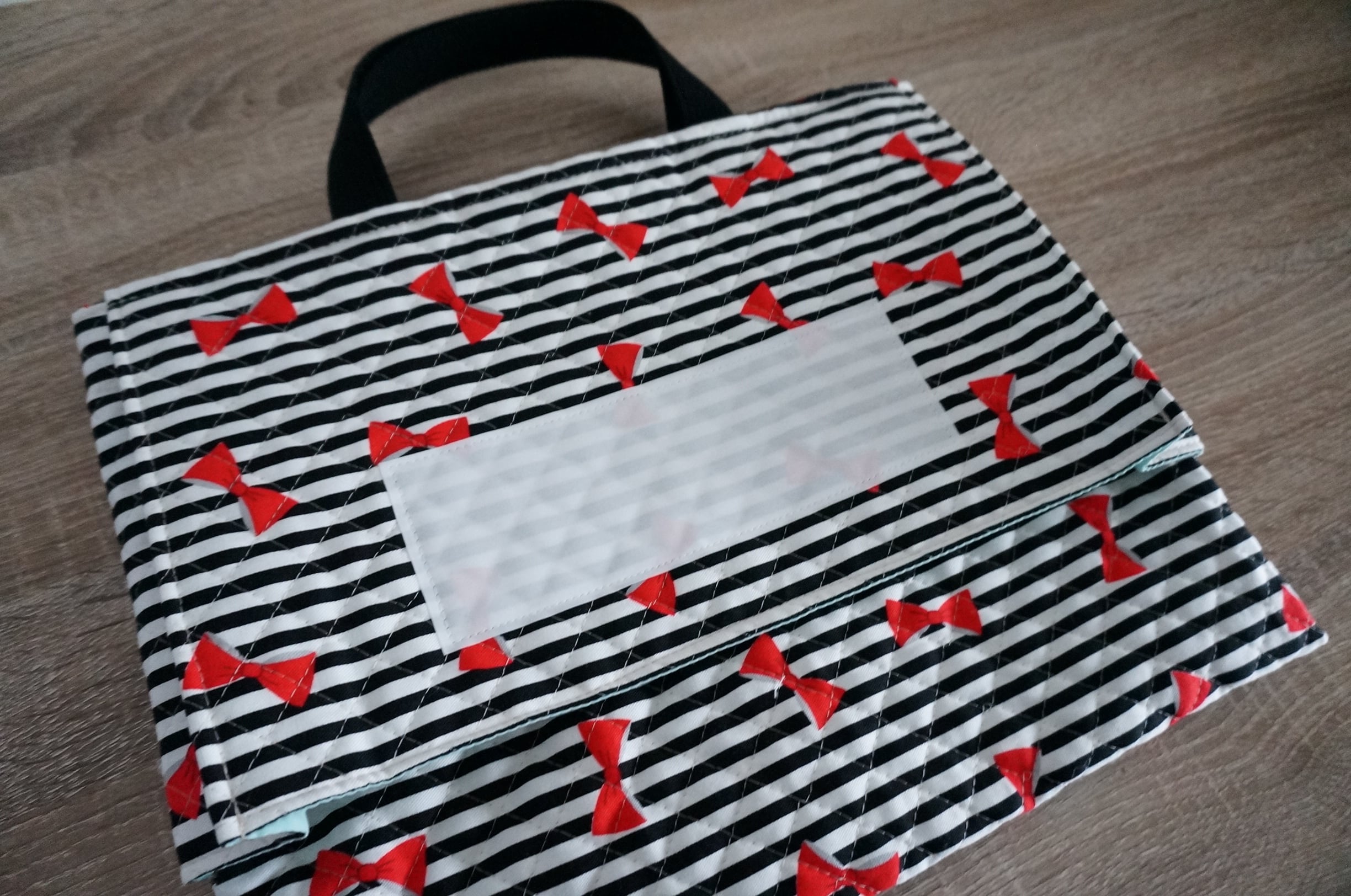【吉田幼稚園教材入れ】お手提げ[黒ボーダー赤リボン柄]