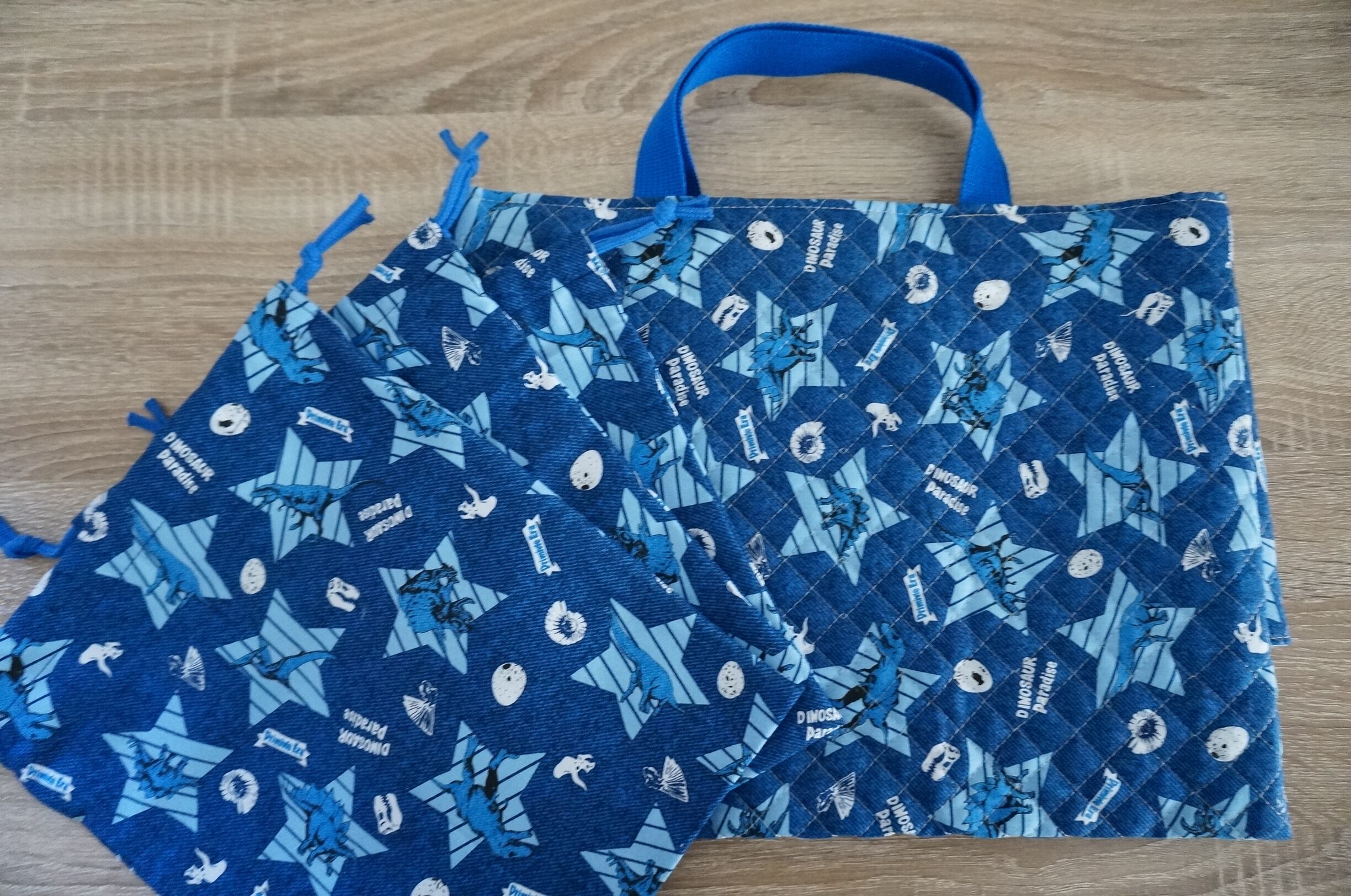 【吉田幼稚園お揃いセット】教材入れ&巾着袋3点[ブルースター恐竜]