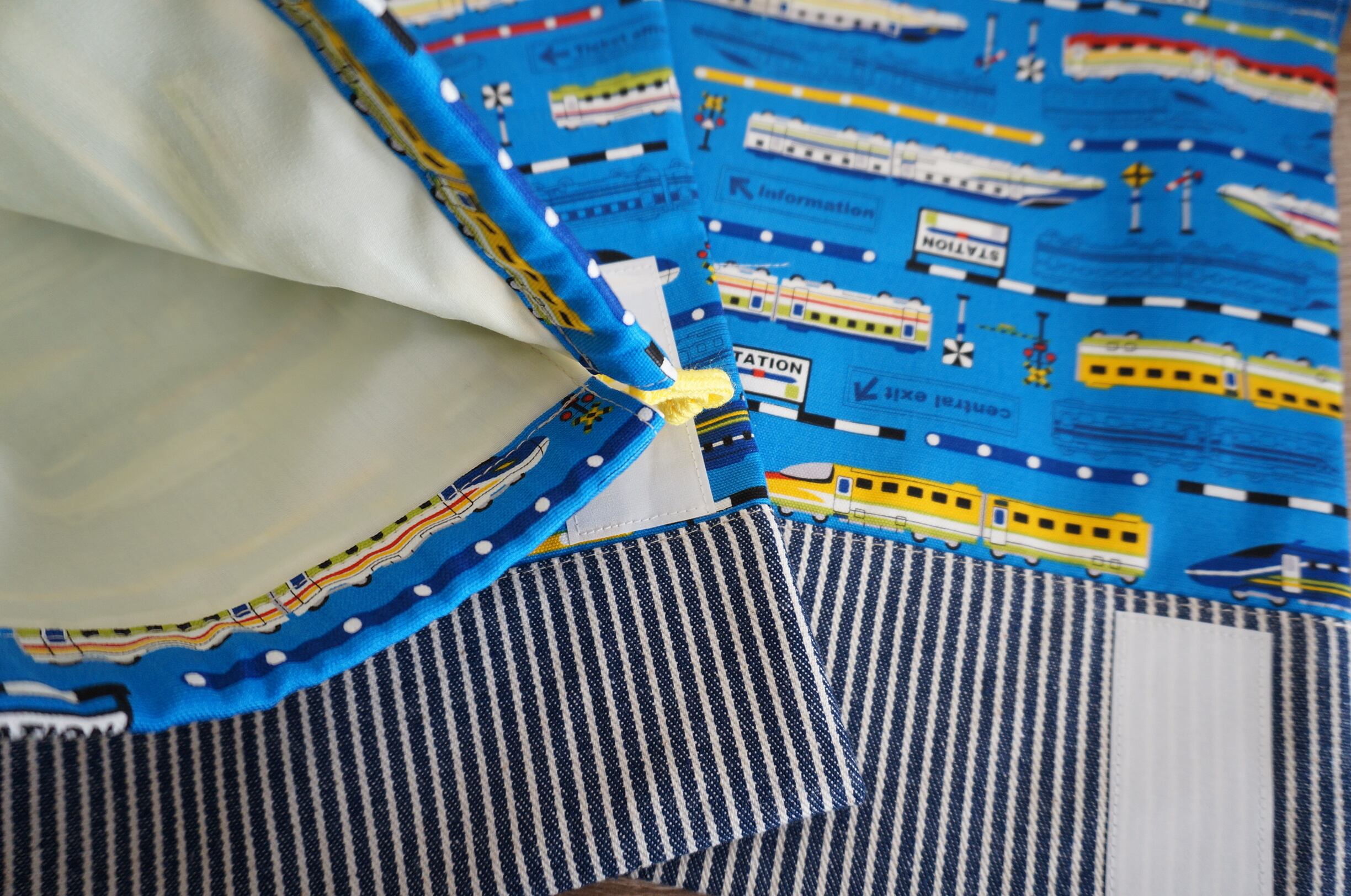 (表側)青系電車柄とヒッコリーデニム柄の切替ありデザイン