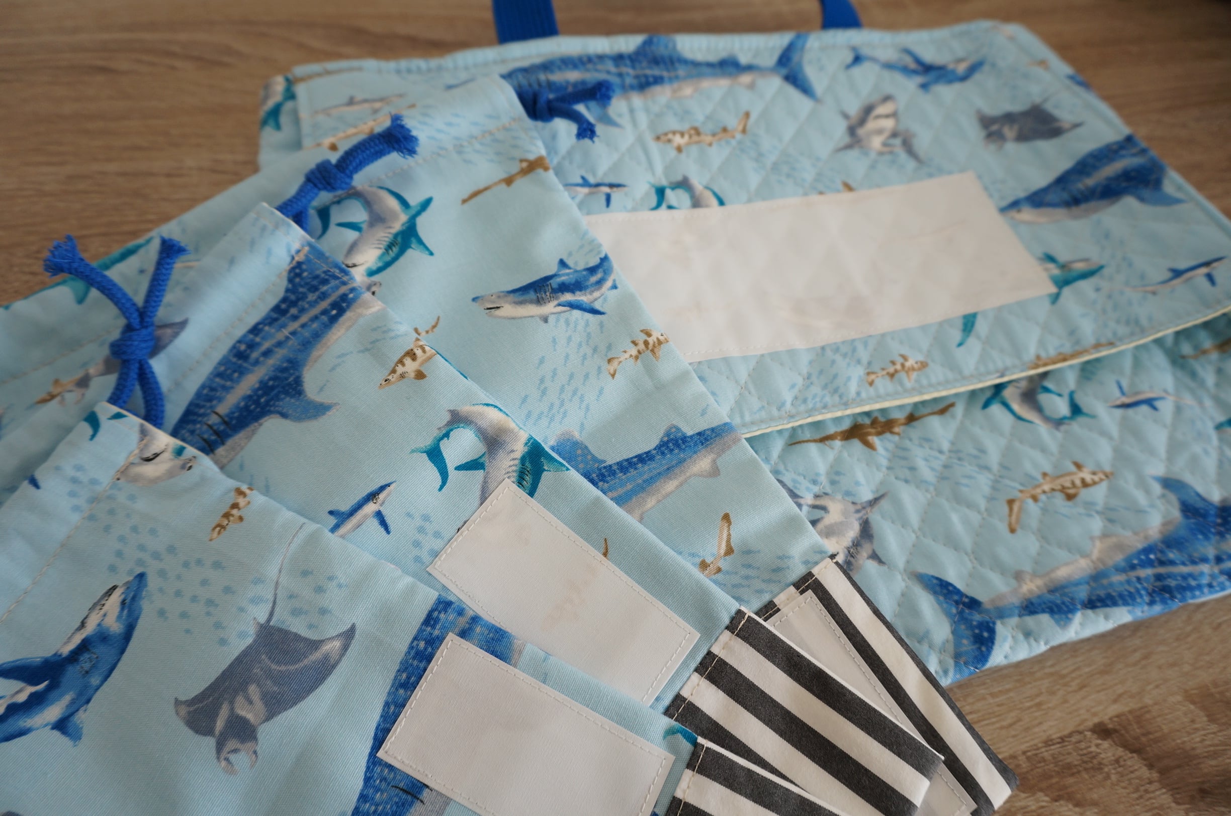 吉田幼稚園への入園準備で必要な「教材入れ(お手提げ)」と「巾着袋3点セット(体操服・上靴・歯磨き)」をお揃いの生地でハンドメイドしました。(バラ売り不可)